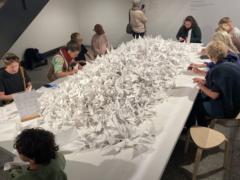 In der Neuen Nationalgalerie Berlin findet derzeit (im September 2025) die Ausstellung „YOKO ONO: DREAM TOGETHER“ statt. Besucher sind eingeladen, u.a. an einem interaktiven Kunstwerk teilzunehmen. Sie sollen Papierkraniche falten, um für den Frieden einzutreten. Manche kommen damit sicherlich dem inneren Frieden näher. Die Omas gegen Rechts in Stuttgart haben ein ähnliches Origami-Projekt. Es trägt den Namen „Falten statt Spalten“ und soll spielerisch das Gemeinsame fördern und dem Spaltenden entgegenwirken.