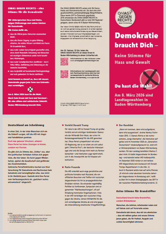Bei der Landtagswahl am 8. März kommt es darauf an, dass wir unsere Demokratie gegen jede Form von Extremismus verteidigen. Keine Stimme für Hass und Gewalt – gebt Eure Stimme denjenigen, die für Freiheit, Respekt und soziale Gerechtigkeit eintreten.