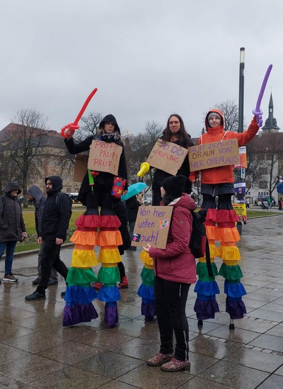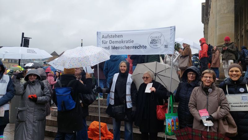 Der Regen konnte sie nicht abhalten: Mehrere Tausend Menschen sind am Samstag, 14. Februar, zur ersten PRÜF-Demo nach Stuttgart gekommen. Mit Musik und szenischen Darstellungen machten Kulturschaffende und Demonstrant*innen, darunter auch viele OMAS GEGEN RECHTS, ihre Forderung deutlich: „Alle Parteien, die vom Verfassungsschutz als rechtsextremer Verdachtsfall oder gesichert rechtsextrem eingestuft werden, sollen durch das Bundesverfassungsgericht überprüft werden.” Weitere PRÜF-Demos fanden in Berlin, Düsseldorf, Hamburg und München statt.