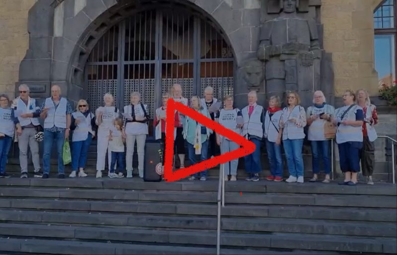 In Recklinghausen umstellen die Omas das Rathaus und singen dabei. Das Video sollte nach dem Klick auf das Bild erscheinen und enthält den Text zum Mitsingen. (b.).