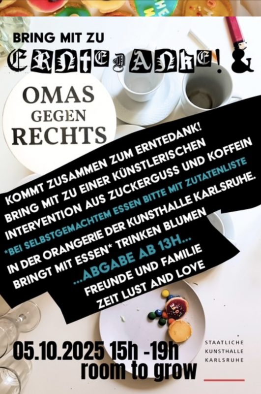 Im Rahmen von „Room to Grow“, einer von der Kunsthallte Karlsruhe initiierten Veranstaltungsreihe, laden das Künstlerkollektiv „ErnteDanke“ die Karlsruher „Omas gegen Rechts“ am 5. Oktober zum Erntedankfest in die Orangerie der Staatlichen Kunsthalle Karlsruhe ein. Tinka Stock und Nils Weiligmann sind Teil des genannten Künstlerkollektivs. Sie schätzen sehr, wie sie sagen, die Authentizität der Omas. Zu der Tafel, bei der sich in den letzten vier Wochen zahlreiche Vereine und Institutionen der Öffentlichkeit vorgestellt haben, darf Kaffee, Kuchen, Blumen und alles, was den Omas nützlich ist, mitgebracht werden.(b.)