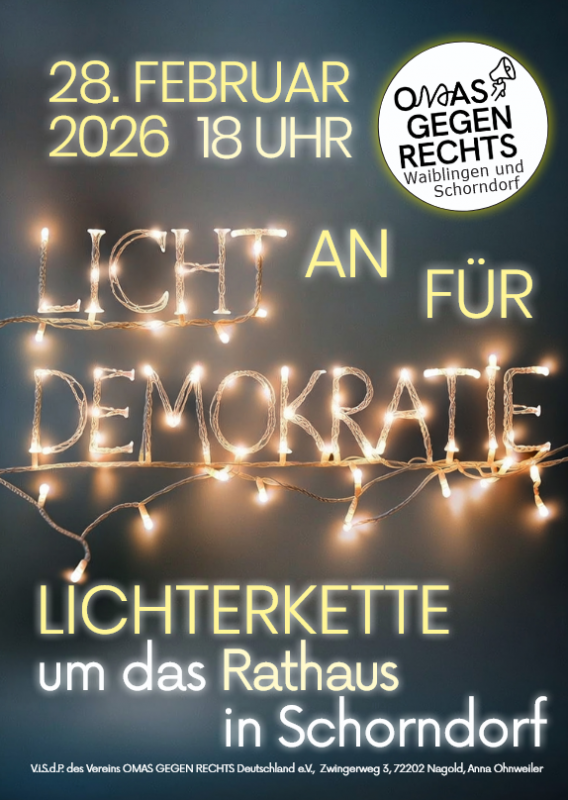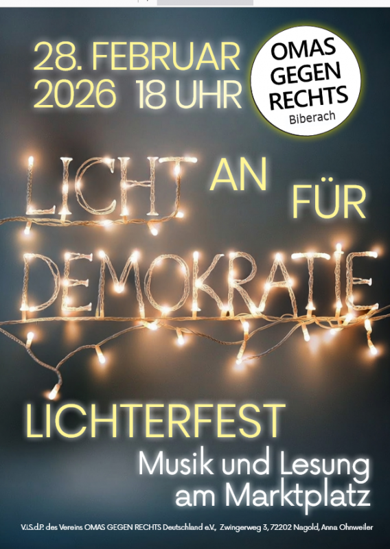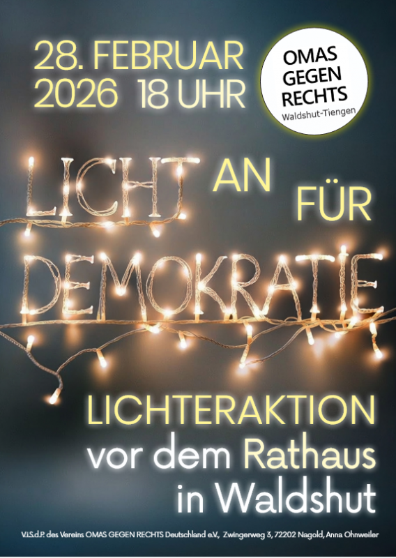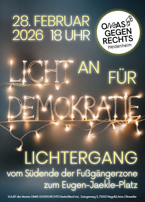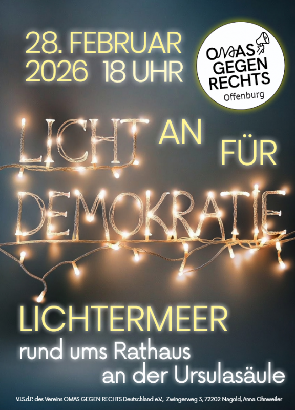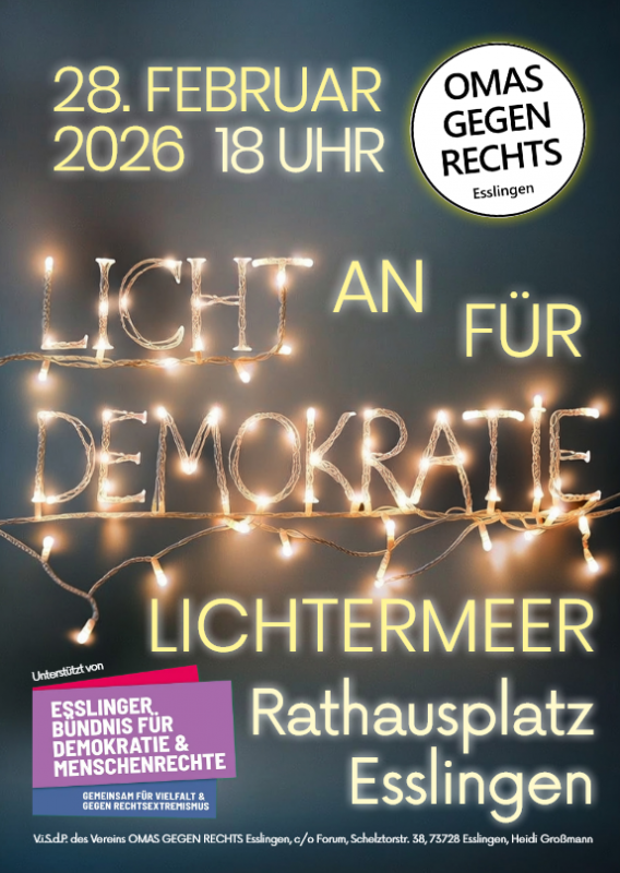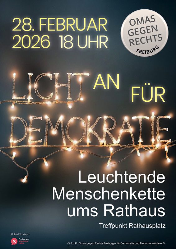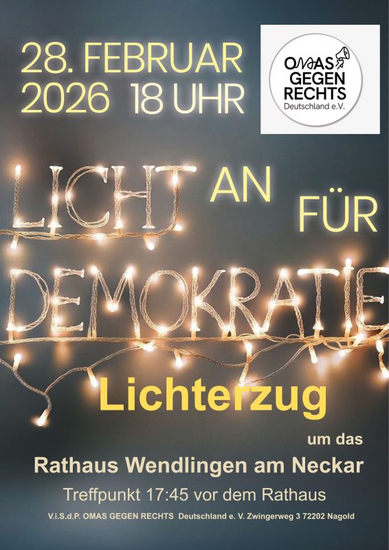 In mehr als 20 Städten in Baden-Württemberg sind am Samstag, 28. Februar, 18 Uhr, Lichterfeste und Lichterketten, Mahnwachen, Lesungen und andere Veranstaltungen geplant. Mit der landesweiten Aktion „Licht an für Demokratie“ wollen die OMAS GEGEN RECHTS vor der Landtagswahl ein Zeichen für Demokratie und Menschenrechte setzen. Macht mit, zeigt Gesicht, tragt euer Licht für Demokratie hinaus – damit unser Land hell bleibt.