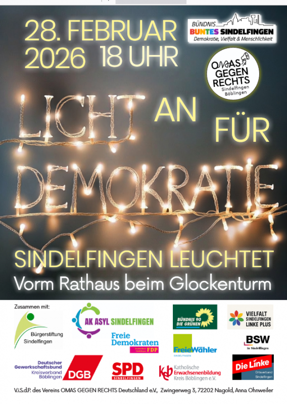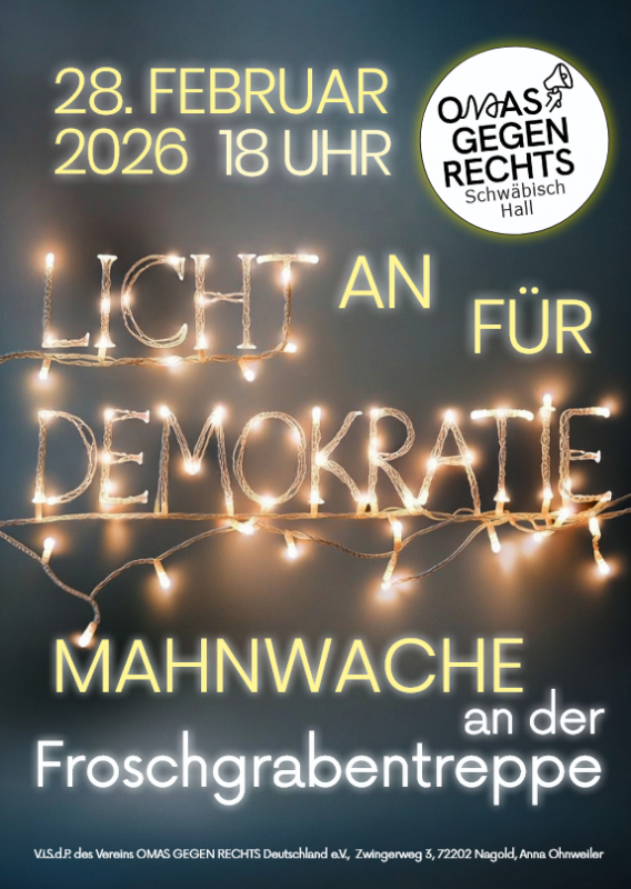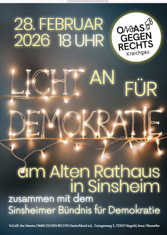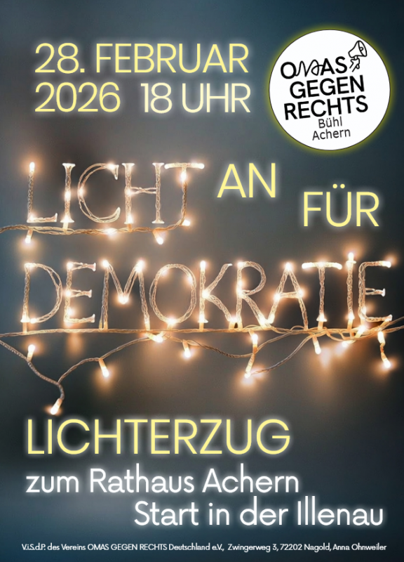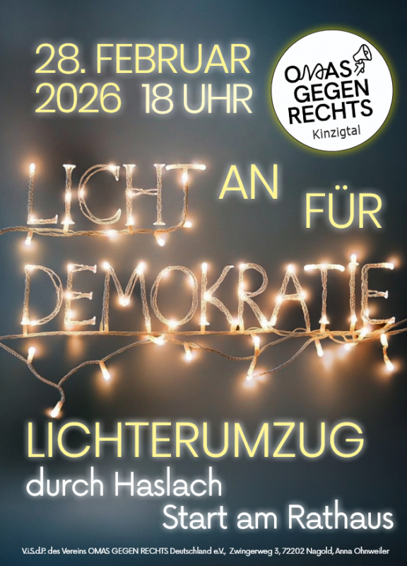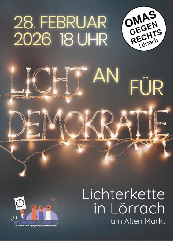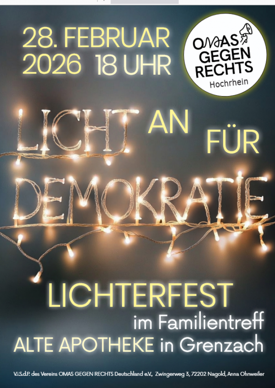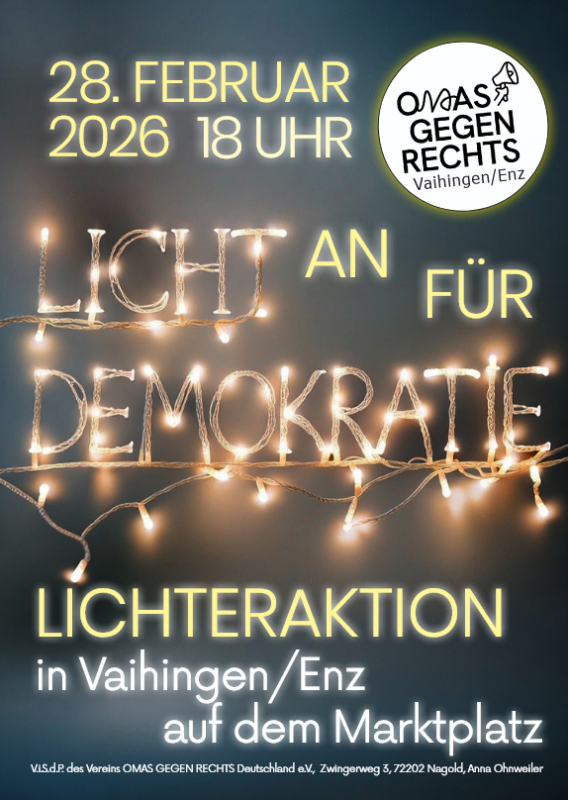 In mehr als 20 Städten in Baden-Württemberg sind am Samstag, 28. Februar, 18 Uhr, Lichterfeste und Lichterketten, Mahnwachen, Lesungen und andere Veranstaltungen geplant. Mit der landesweiten Aktion „Licht an für Demokratie“ wollen die OMAS GEGEN RECHTS vor der Landtagswahl ein Zeichen für Demokratie und Menschenrechte setzen. Macht mit, zeigt Gesicht, tragt euer Licht für Demokratie hinaus – damit unser Land hell bleibt.