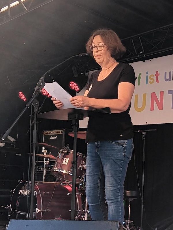 Auch in Schorndorf mischen sich neuerdings OMAS GEGEN RECHTS aktiv in die politische Debatte vor Ort ein. Als das Schorndorfer „Bündnis gegen Rechts“ am 29. Juli gegen einen so genannten „Bürgerdialog“ der AfD in der Künkelin-Halle demonstrierte, trat auch die neue OgR-Ortsgruppe Schorndorf erstmals öffentlich in Erscheinung. An diesem Tag hielten Mitglieder der Gruppe ihre erste öffentliche Rede und bezogen klar Stellung gegen rechte Ideologien, Rassismus und Frauenfeindlichkeit.