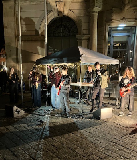Etwa 400 Personen umarmen mit einer singenden und leuchtenden Menschenkette das historische Rathaus und das neue Dokumentationszentrum Nationalsozialismus. Musikalisch unterstützen die Sänger:innen des Chores Viva la Vida und ein Akkordeonspieler diese Aktionen.