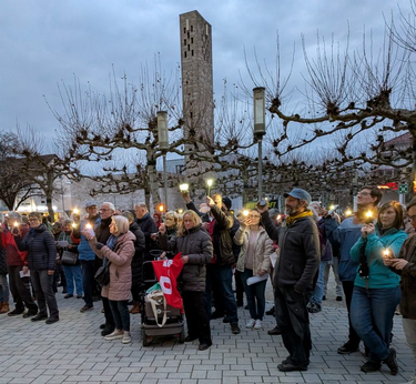 Rund 200 Personen verwandeln den Platz um die Ursulasäule vor dem Offenburger Rathaus in ein Lichtermeer. Nach einer Rede singen alle gemeinsam. (Fotos. Christian Möhle)