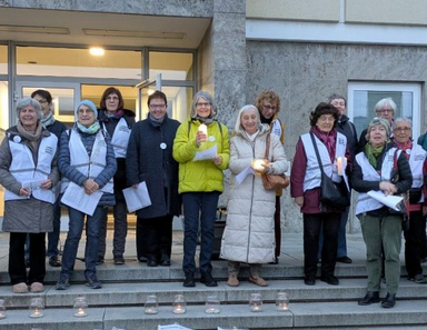 Etwa 70 Personen zünden vor dem Rathaus Waldshut das „Licht an für Demokratie“. Es gibt viel Zuspruch von Passanten, von denen sich einige auch ausführlicher über diese Aktion und das Engagement der „Omas gegen Rechts“ informieren.