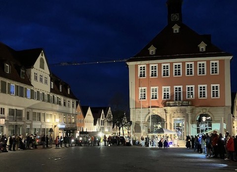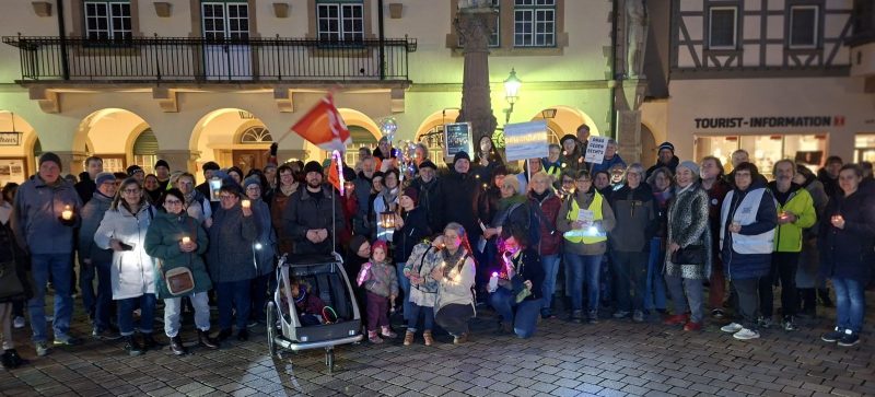 Die „Omas gegen Rechts“ Wiesental haben auf den Lindenplatz am Schopfheimer Rathaus eingeladen. Viele kommen und bilden eine große, beleuchtete Menschenkette um den Rathausplatz.