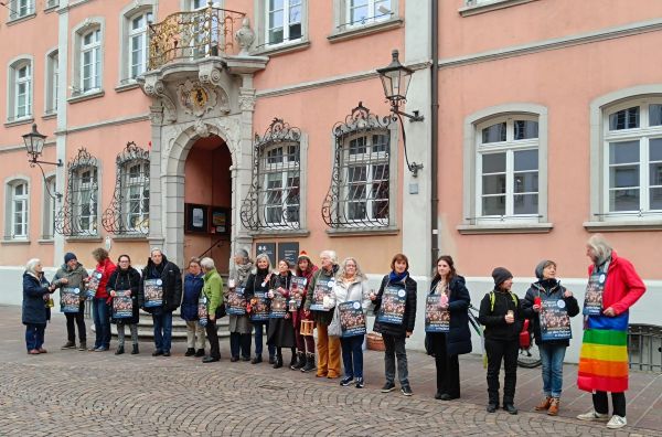 Auf dem Marktplatz lesen die Biberacherinnen Texte von Konstantin Wecker vor, der Biberacher Künstler Peter Zoufal singt (Facebook). Anschließend gibt es Tee, Infomaterialien und viele Gespräche mit den 80 Teilnehmer*innen.